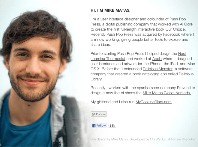 Dribbbleはやっていませんが、弊社チーフUIデザイナーがMatasについて触れないなんてあり得ない!と言うのでおまけとして入れました。18歳でWil ShipleyとDelicious Monsterを立ち上げ、その後19歳という若さでAppleのデザイナーになり、iPhoneやiPad、MacのOS XなどのUIを数多く手掛けました。4年間働いた後に立ち上げたPush Pop Pressで手掛けたデジタルブック”Our Choice”についての TEDトークは必見です。Our ChoiceからiBooks Authorが生まれたほど影響力の強いMatas。その後Push Pop PressはFacebookに買収されたので現在はFacebookにいます。