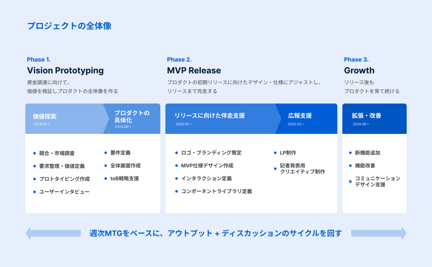 この成果を基に、プロジェクトは次のステップへと移行します。2024年8月からは、MVPのリリースと、リリース後の改善サイクルをサポートするフェーズがスタートし、プロダクトのコアとなるロゴやブランドトーンを制作し、事業のコンセプトを可視化。さらに、サービスLPを制作し、セールス体制の構築の支援も行っています。