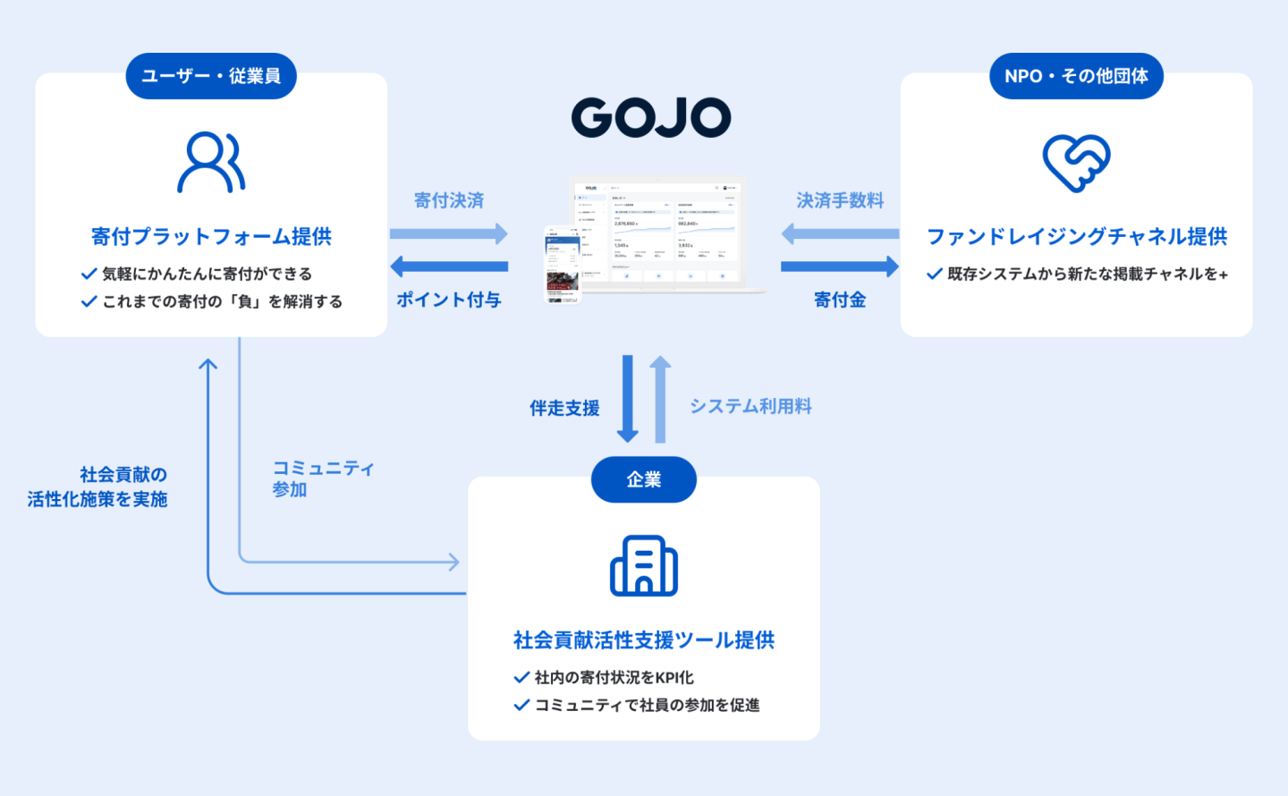 「GOJO」は、ソーシャルセクター(NPOなど)と企業・従業員をつなぎ、寄付を通じた社会貢献活動を促進する寄付プラットフォームです。主な対象ユーザーは、寄付を受け付けるソーシャルセクター、および個人の寄付者となる企業の従業員、そして法人そのものです。