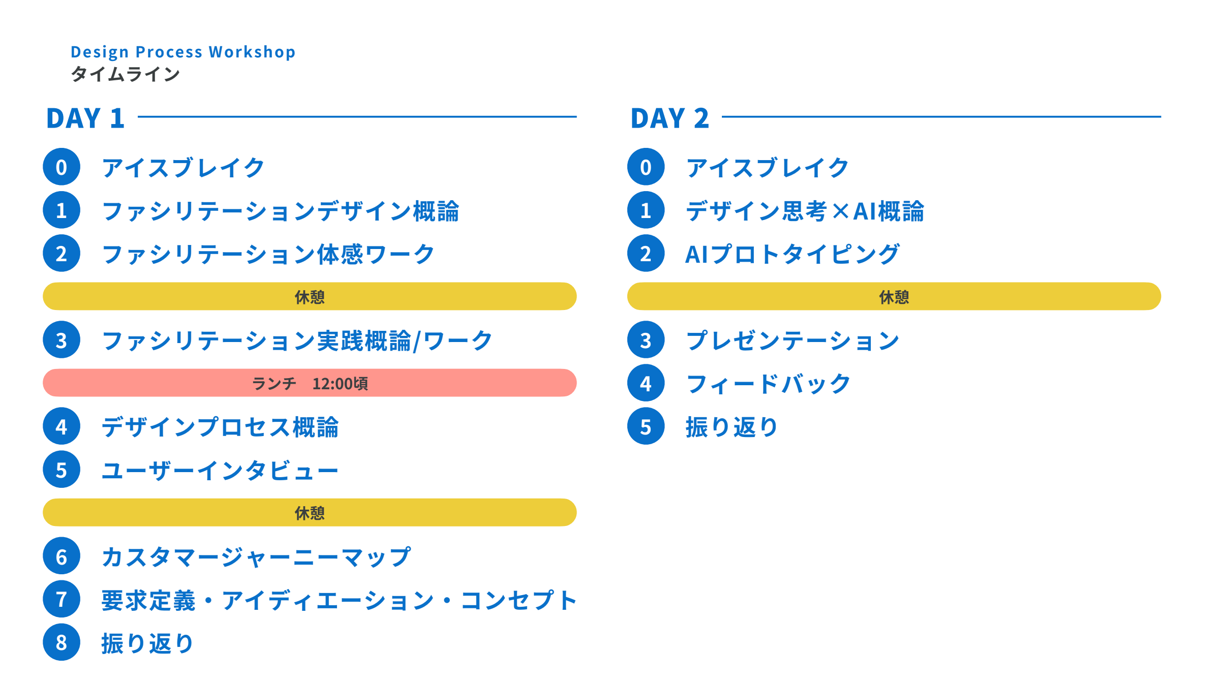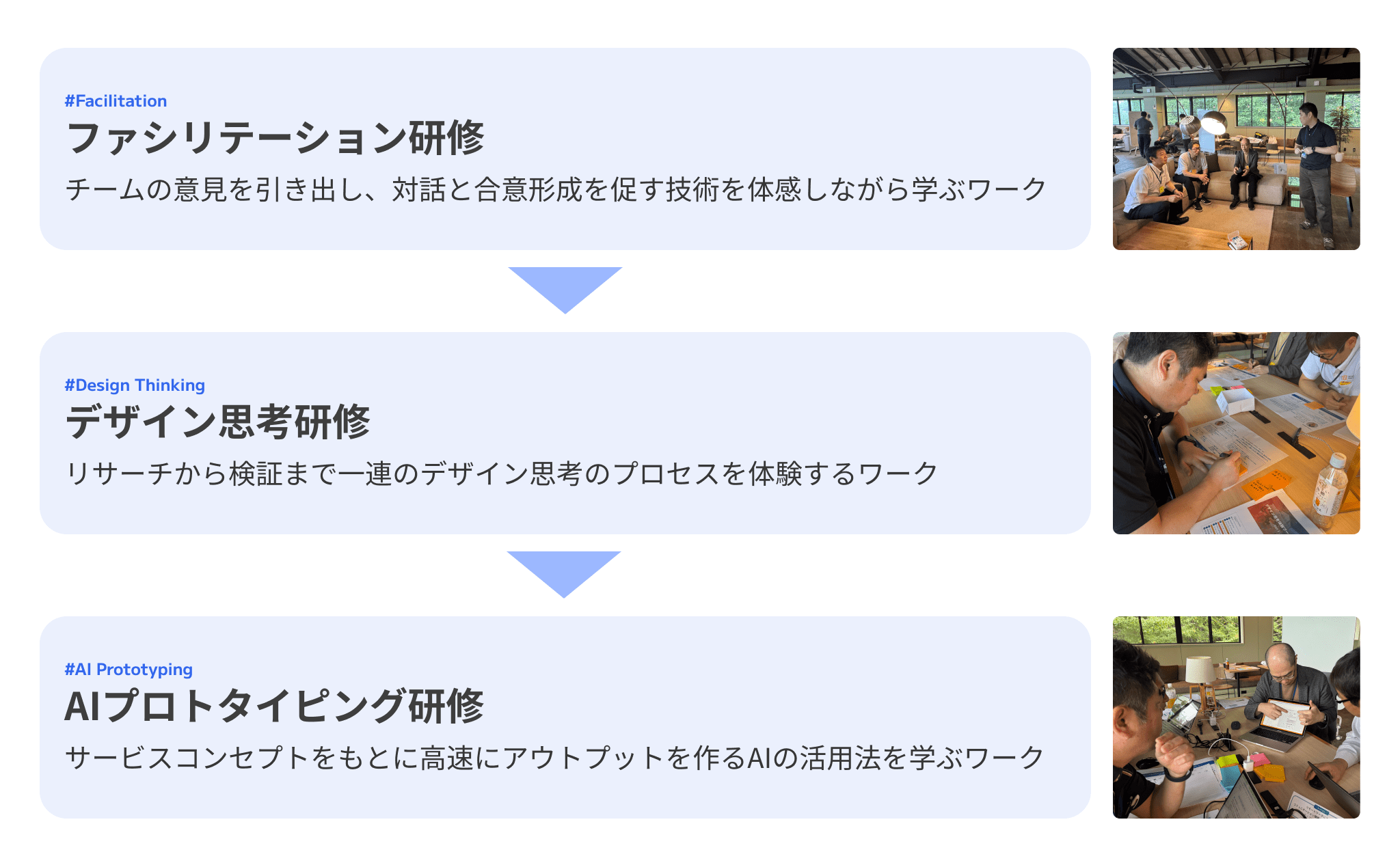 - ファシリテーション研修: チームでのデザイン思考実践の土台となる、チームの意見を引き出し、対話と合意形成を促す技術を体感し学ぶワーク